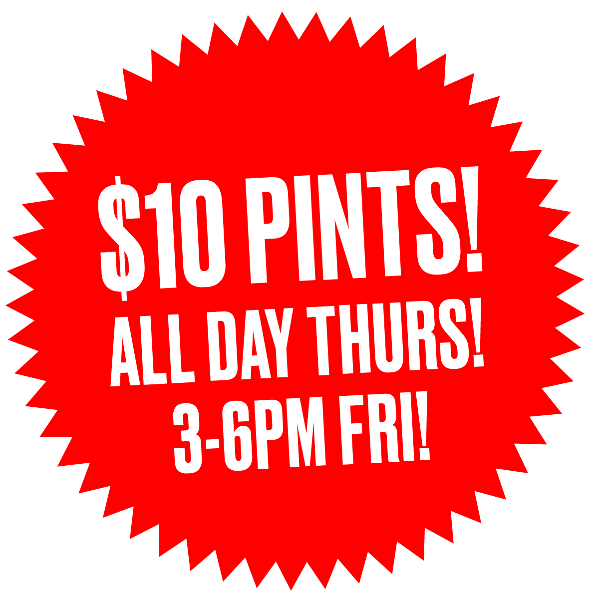 $10 PINTS ALL DAY THURSDAY - $10 PINTS 3-6PM FRIDAYS - WEEKEND DRINK SPECIALS - $10 PINTS ALL DAY THURSDAY - $10 PINTS 3-6PM FRIDAYS - WEEKEND DRINK SPECIALS
